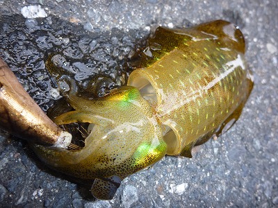 しばらく続けるとフグに邪魔されてストレスMAXのアオリが隙を突いて、エギにアタック!
