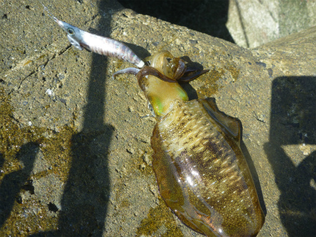 沖のシモリにエギが近づいた時ヒットしました。