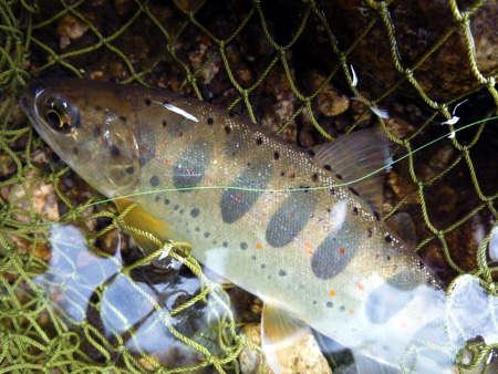 その後また虹鱒をキャッチしたりして、ほぼ上流域で岩陰から一直線にミノーにアタック!