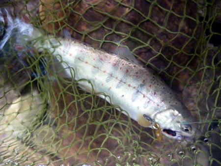 重たいので時間をかけて上がってきたのは予想通り「でっかい虹鱒」